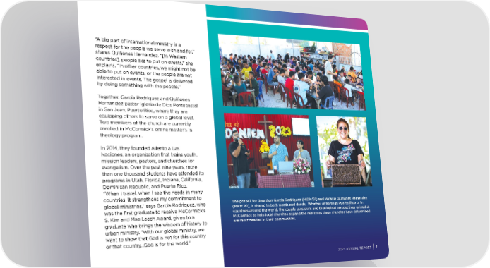 “A big part of international ministry is a respect for the people we serve with and for,” shares Quiñones Hernandez. “[In Western countries], people like to put on events,” she explains. “In other countries, we might not be able to put on events, or the people are not interested in events. The gospel is delivered by doing something with the people.” Together, García Rodriquez and Quiñones Hernandez pastor Iglesia de Dios Pentecostal in San Juan, Puerto Rico, where they are equipping others to serve on a global level. Two members of the church are currently enrolled in McCormick’s online master’s in theology program. In 2014, they founded Aliento a Las Naciones, an organization that trains youth, mission leaders, pastors, and churches for evangelism. Over the past nine years, more than one thousand students have attended its programs in Utah, Florida, Indiana, California, Dominican Republic, and Puerto Rico. “When I travel, when I see the needs in many countries, it strengthens my commitment to global ministries,” says García Rodriquez, who The gospel, for Jonathan Garcia Rodriquez (M.Div.’21) and Melanie Quinones Hernandez was the 昀椀rst graduate to receive McCormick’s (MAM’20), is shared in both words and deeds. Whether at home in Puerto Rico or in countries around the world, the couple uses skills and theological perspectives gained at S. Kim and Mae Leech Award, given to a McCormick to help local churches expand the ministries these churches have determined graduate who brings the wisdom of history to are most needed in their communities. urban ministry. “With our global ministry, we want to show that God is not for this country or that country…God is for the world.” 2023 ANNUAL REPORT 7