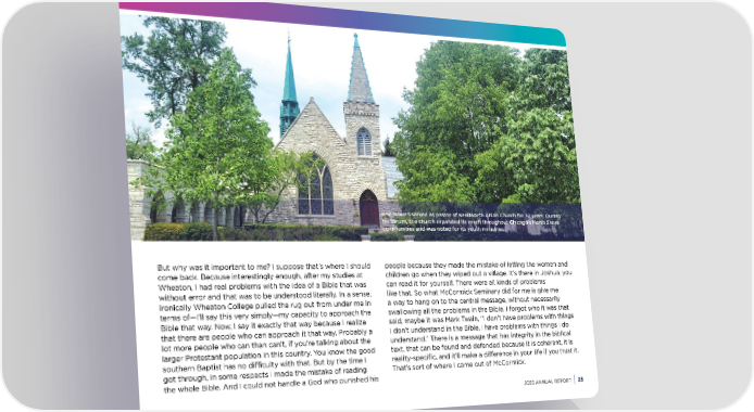 Rev. Bowen served as pastor of Kenilworth Union Church for 37 years. During his tenure, the church expanded its reach throughout Chicago’s North Shore communities and was noted for its youth ministries. But why was it important to me? I suppose that’s where I should people because they made the mistake of letting the women and come back. Because interestingly enough, after my studies at children go when they wiped out a village. It’s there in Joshua; you Wheaton, I had real problems with the idea of a Bible that was can read it for yourself. There were all kinds of problems without error and that was to be understood literally. In a sense, like that. So what McCormick Seminary did for me is give me ironically Wheaton College pulled the rug out from under me in a way to hang on to the central message, without necessarily terms of—I’ll say this very simply—my capacity to approach the swallowing all the problems in the Bible. I forgot who it was that Bible that way. Now, I say it exactly that way because I realize said, maybe it was Mark Twain, “I don’t have problems with things that there are people who can approach it that way. Probably a I don’t understand in the Bible, I have problems with things I do lot more people who can than can’t, if you’re talking about the understand.” There is a message that has integrity in the biblical larger Protestant population in this country. You know the good text, that can be found and defended because it is coherent, it is southern Baptist has no di昀케culty with that. But by the time I reality-speci昀椀c, and it’ll make a di昀昀erence in your life if you trust it. got through, in some respects I made the mistake of reading That’s sort of where I came out of McCormick. the whole Bible. And I could not handle a God who punished his 2023 ANNUAL REPORT 25