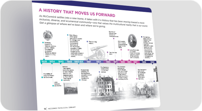 A HISTORY THAT MOVES US FORWARD As McCormick settles into a new home, it takes with it a history that has been moving toward a more inclusive, diverse, and ecumenical community—one that values the multicultural reality that is our world. Get a glimpse of where we’ve been and where we’re going. Reunion of Old and New Schools of The Seminary New Albany Presbyterianism builds homes on Theological Chalmers Place. Seminary is moved McCormick’s Initially, the to Chicago and The Civil War role in Korean Seminary planned renamed the begins. Presbyterianism to borrow Seminary Presbyterian begins in the $100,000 to build founded in Seminary of 1880s. the homes until Hanover, Indiana the Northwest, Mrs. McCormick as the Indiana operating initially Cyrus McCormick intervened and Theological out of a hotel dies. Nettie contributed the Seminary. located at the The Civil War Fowler McCormick funds noting, “We Students attend southwest corner of ends. continues support do not believe in classes in a log Clark and Harrison of the Seminary mortgaging the cabin. streets. and its program. property…” 1829 1834 1840 1859 1860-64 1861 1864 1865 1871 1880 1884 1887 1889 1890 Indiana The Seminary The Seminary Theological moves to the survives the Seminary moves Presbyterian Lincoln Park Great Chicago The Presbyterian to New Albany, Seminary of campus. Fire, which stops Seminary of Founding of Indiana, and the Northwest just blocks east the Northwest Lane Seminary changes name occupies several of the campus is renamed in Cincinnati to New Albany temporary which becomes a McCormick Theological locations in refuge for many Theological Seminary. Chicago. escaping the 昀椀re. Seminary. Lane Debates on slavery 12 MCCORMICK THEOLOGICAL SEMINARY