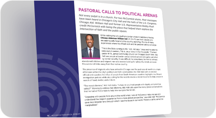 PASTORAL CALLS TO POLITICAL ARENAS Not every pulpit is in a church. For two McCormick alums, their messages have been heard in Chicago’s City Hall and the halls of the U.S. Congress. Chicago Ald. William Hall and former U.S. Representative Bobby Rush credit McCormick with being the place that helped them explore the intersection of faith and the public square. While visiting the U.S. southern border where it neighbors Mexico, Chicago Alderman William Hall (M. Div.’11) saw how people who are seeking safe havens in this country are living. It’s one of many experiences where his o昀케cial work and his pastoral calling converge. “This is the Bible coming to life,” Ald. Hall says. “Jesus and his parents were asylum seekers. This is Jesus’ story in the thousands.” The lead pastor at St. James Community Church on Chicago’s South Side, Ald. Hall saw people at border camps behind barbed wire gates patrolled by border security. It was di昀케cult, he remembers, for him to witness abandoned children and migrant men and women looking for safety—hundreds and even thousands—of miles away from their native country. The presence of migrants who have arrived in Chicago over the past several months is a topic of tension within the city’s political and faith communities. For Ald. Hall, both an elected o昀케cial and a pastor, the in昀氀ux of people from South American countries highlights insu昀케cient immigration policies while also calling for the need to invoke a moral response to help people in search of food, shelter, and a future. “The moral dilemma,” Ald. Hall states, “is how do you treat people with dignity and prioritize safety?” Working to address that dilemma, Ald. Hall calls upon the many global conversations that he had at McCormick to help him navigate this terrain. “Engaging with people from around the world when I was at McCormick helps me see and understand the migrant experience from a more global perspective,” says Ald. Hall. “McCormick gave me a broader lens through which I see the issues in our world. There’s a call to serve the marginalized.” 10 MCCORMICK THEOLOGICAL SEMINARY