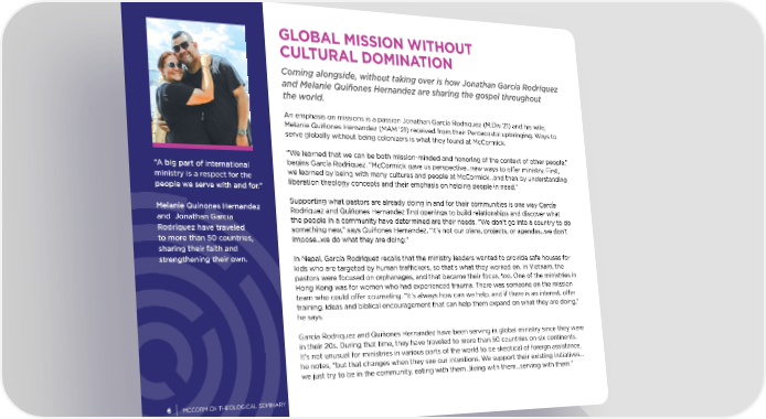GLOBAL MISSION WITHOUT CULTURAL DOMINATION Coming alongside, without taking over is how Jonathan García Rodriquez and Melanie Quiñones Hernandez are sharing the gospel throughout the world. An emphasis on missions is a passion Jonathan García Rodriquez (M.Div.’21) and his wife, Melanie Quiñones Hernandez (MAM ’21) received from their Pentecostal upbringing. Ways to serve globally without being colonizers is what they found at McCormick. “We learned that we can be both mission-minded and honoring of the context of other people,” “A big part of international begins García Rodriquez. “McCormick gave us perspective…new ways to o昀昀er ministry. First, ministry is a respect for the we learned by being with many cultures and people at McCormick…and then by understanding people we serve with and for.” liberation theology concepts and their emphasis on helping people in need.” Melanie Quinones Hernandez Supporting what pastors are already doing in and for their communities is one way García and Jonathan Garcia Rodriquez and Quiñones Hernandez 昀椀nd openings to build relationships and discover what the people in a community have determined are their needs. “We don’t go into a country to do Rodriquez have traveled something new,” says Quiñones Hernandez. “It’s not our plans, projects, or agendas…we don’t to more than 50 countries, impose…we do what they are doing.” sharing their faith and strengthening their own. In Nepal, García Rodriquez recalls that the ministry leaders wanted to provide safe houses for kids who are targeted by human tra昀케ckers, so that’s what they worked on. In Vietnam, the pastors were focused on orphanages, and that became their focus, too. One of the ministries in Hong Kong was for women who had experienced trauma. There was someone on the mission team who could o昀昀er counseling. “It’s always how can we help, and if there is an interest, o昀昀er training, ideas and biblical encouragement that can help them expand on what they are doing,” he says. García Rodriquez and Quiñones Hernandez have been serving in global ministry since they were in their 20s. During that time, they have traveled to more than 50 countries on six continents. It’s not unusual for ministries in various parts of the world to be skeptical of foreign assistance, he notes, “but that changes when they see our intentions. We support their existing initiatives… we just try to be in the community, eating with them…living with them…serving with them.” 6 MCCORMICK THEOLOGICAL SEMINARY