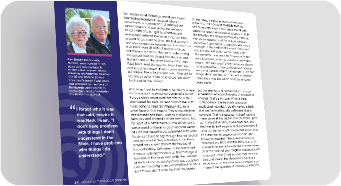 So I ended up at Wheaton, and it was a very of the Bible, is there an inspired message interesting experience, because where I in the 昀椀rst 昀椀ve books of the Bible that we came from, everybody sort of believed the can hang onto, even if we realize that it was same thing, and it was good and we were written by guys like (alphabet soup) J, E, D, P, all committed to it. I got to Wheaton, and the Priestley, the Deuteronomus, the Yahwus, everybody believed the same thing, but they the whole apparatus of the critical scholars argued about it all the time. The 昀椀rst course I as to how it got done? Is there nevertheless a had was a course in Apologetics. And I learned message in the middle of it which is inspired that there were all sorts of insidious forces and is from God which we can hang onto? out there in the world that were undermining The word that was used for “message” is the the gospel. Karl Barth and Emil Brunner and word charigma, which is a Greek word which Rev. Bowen and his wife, Bultman and all the other German “B’s” and means, “the message.” (That’s what we always Marlene, were married for 63 Paul Tillich. And the guy would set them up do in scholarship, think up Greek and German years and were partners in and knock ’em down. That’s a good teaching words for normal English ‘whatevers.’) The one ministry. Both enjoyed music, technique. The only problem was, I thought he thing I didn’t get into with respect to where I traveling and together, directed set ’em up better than he knocked ’em down. came from was the whole business of being the Gil and Marlene Bowen And I ran for the library.” born again. Christian Outreach Fund which was endowed by members of Kenilworth Union Church to And when I got to McCormick Seminary, where But the emphasis in evangelicalism is upon encourage a host of ministries half the guys it seemed were engineers out of experiential, emotional worship of one sort or the Bowen’s supported. Purdue who’d never even opened the Bible, I another. That’s a big deal. When I went was loaded for bear. I’d read most of the stu昀昀 to McCormick, the emphasis was upon I forgot who it was I was going to read. So Wheaton did me a intellectual integrity, typically. Having a faith “ great favor in that regard. They stimulated me that can be intellectually defended, that is that said, maybe it intellectually and then I went to McCormick coherent. That makes sense. It didn’t have to was Mark Twain, “I Seminary and entered a whole new world. And make sense at the Baptist church where I grew don’t have problems for want of a better term, let me simply say it up. It was in the book, it was preached, and with things I don’t was a world of liberal criticism and not words that was it. So it was a kind of authoritarian. If of God, but nevertheless concerned with what I can use the term with the Baptist experience, understand in the God might have to say through the manuscript. an authoritarian experientialism. Can I put Bible, I have problems And we called it Neo-orthodoxy. I was there those two together? Because the minister with things I do in what was known then as the heyday of preached the Bible. And the Bible was to be Neo-orthodoxy. Orthodoxy in the sense that accepted as inerrant and literal in every sense. understand.” it was an attempt to shore up the message of And the heart of your religious experience was the Bible at the same time while the criticism to accept Jesus Christ as your own personal of the text and its development was accepted. lord and savior. The McCormick Seminary (All this I’m doing in an oversimpli昀椀ed fashion.) experience, on the other hand, involved much So if Moses didn’t write the 昀椀rst 昀椀ve books more of the question of intellectual integrity. 24 MCCORMICK THEOLOGICAL SEMINARY